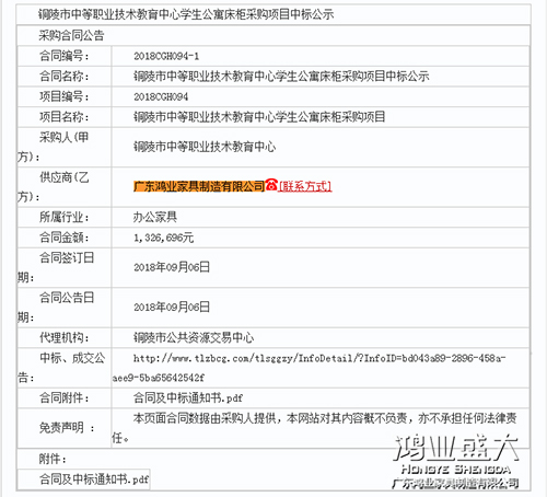 受安徽銅陵市公共資源交易中心的委托,就安徽銅陵市中等職業(yè)技術(shù)教育中心學(xué)校家具學(xué)生公寓床柜采購(gòu)項(xiàng)目進(jìn)行了公開招標(biāo)采購(gòu),按規(guī)定程序組織了公開招標(biāo),廣東鴻業(yè)家具制造有限公司以人民幣1,326,696元奪下了安徽銅陵市中等職業(yè)技術(shù)教育中心學(xué)校家具學(xué)生公寓床柜采購(gòu)項(xiàng)目。